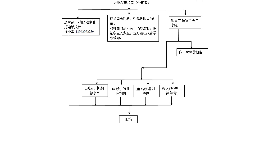 2、(情况危急且不受控制的情况下)组长接到通知后,迅速赶赴现场,同时拨打“110”,通知警察(迅速前往现场阻止),与此同时,安全组长一面迅速召集最近的教师(最好是男教师)赶赴现场,阻止欺凌者施暴,一面通知现场安全组组长前往现场。